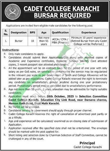 Home JobsAlert.pk Cadet College Karachi Jobs 2025 For Bursar Latest Advertisement byTwin's City -Tuesday, October 14, 2025 //ads via JobsAlert.pk https://jobsalert.pk/cadet-college-gadap-karachi-jobs-2016-for-lecturer-eligibility-criteria/61542 //ads Tags JobsAlert.pk Jobs Today Jobs Facebook Twitter Share:Cadet College Karachi Jobs 2025 For Bursar Latest Advertisement Facebook Twitter WhatsApp Pinterest LinkedIn Reddit Tumblr Telegram Email